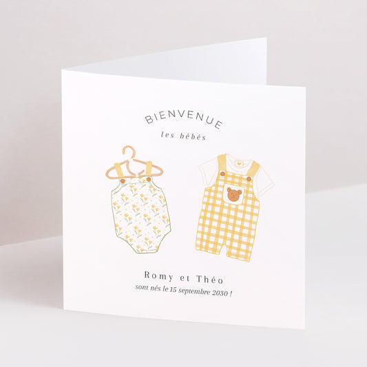 Faire-part naissance Carré double voletJumeaux trousseauxPrix habituel à partir de 1,42 € l'unité